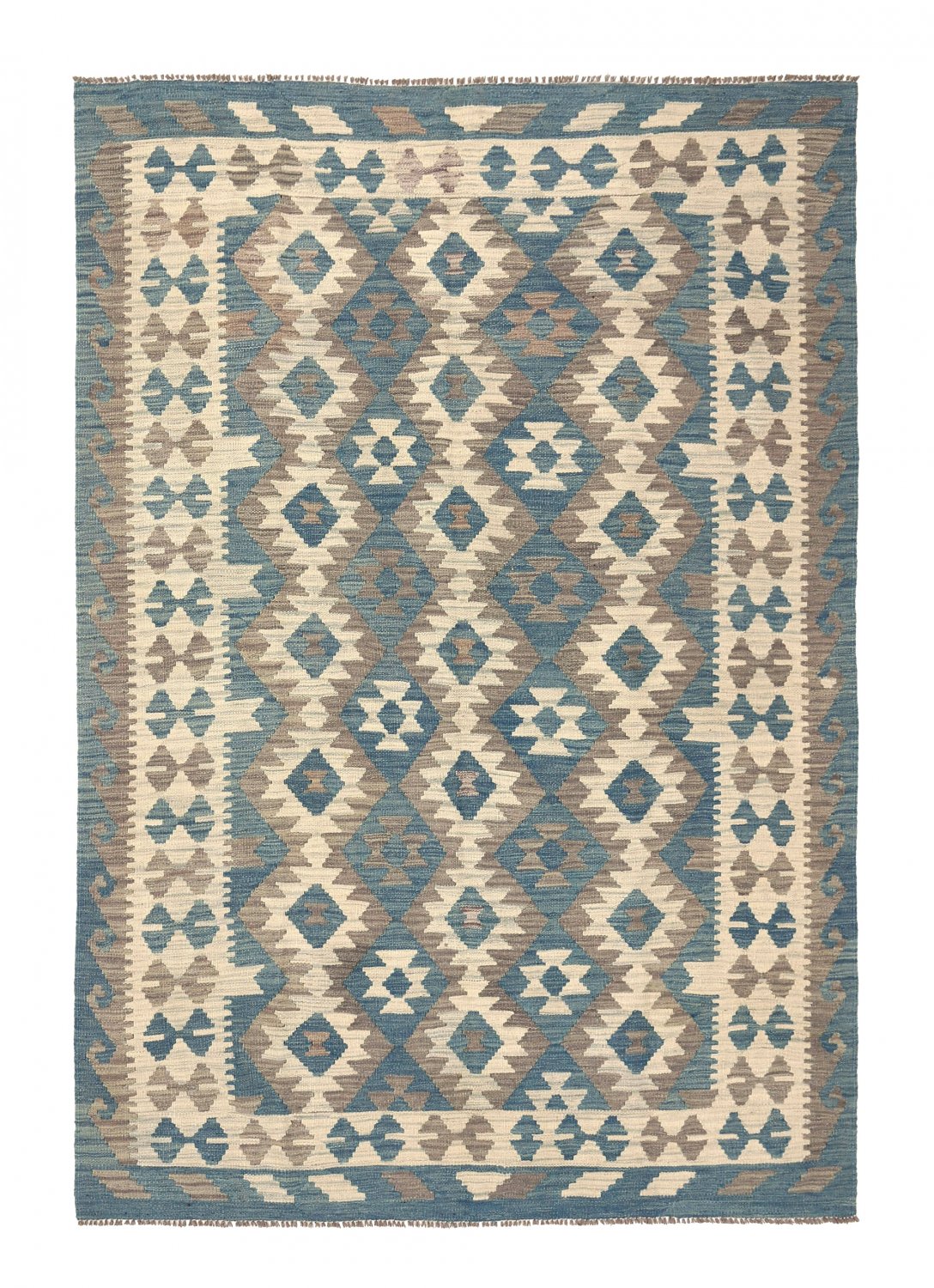 La alfombra kilim oriental combina una estructura tejida en plano con lana natural, creando una pieza ligera y flexible fácil de colocar en pasillos, salones o bajo la mesa de comedor. Su perfil delgado es ideal para superponer sobre alfombras más grandes.